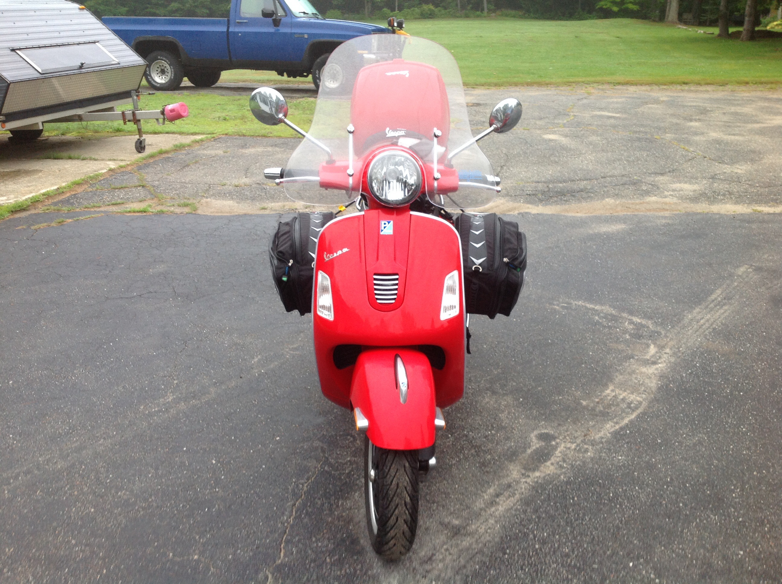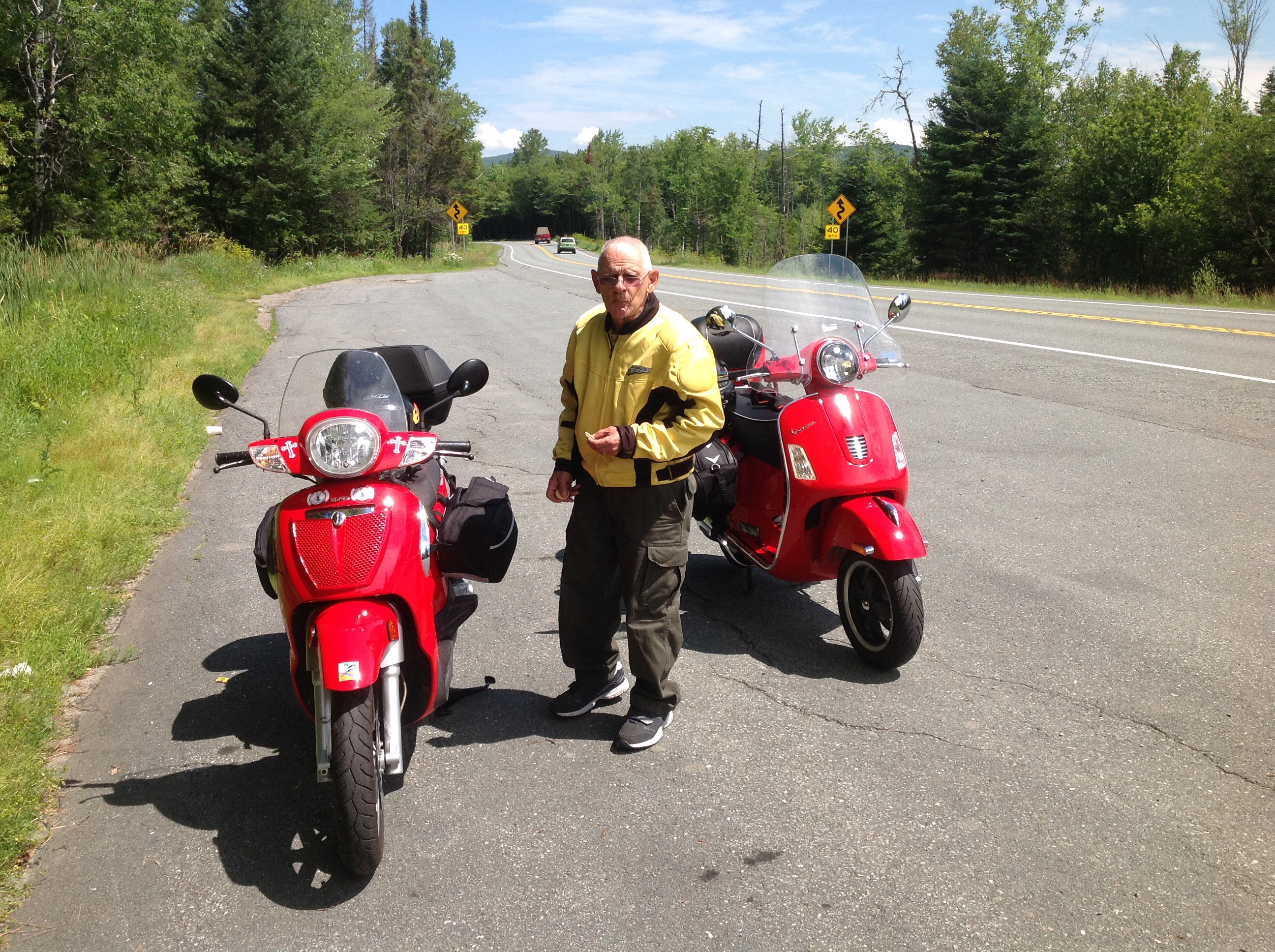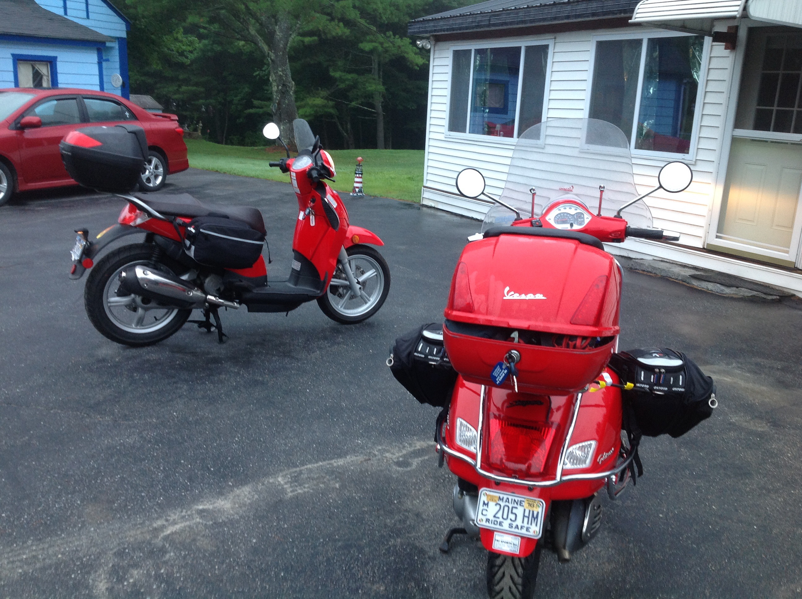 Here are the bikes just prior to departure. I need to say a bit about the luggage, as it is the first time I have used it and so far have found it to be excellent. You can see on the Vespa two pannieres made by Oxford, their “X50” model. Last year, when Robin and I took this trip across northern New England, I used a small suitcase that she had purchased for the purpose. It worked OK, except that because it was strapped on the seat behind me (passenger style), it not only poked me in the back the whole trip, but also had to be untied and re-tied every time I needed gas (since the fuel fill is under the seat) — very tedious and time-consuming.