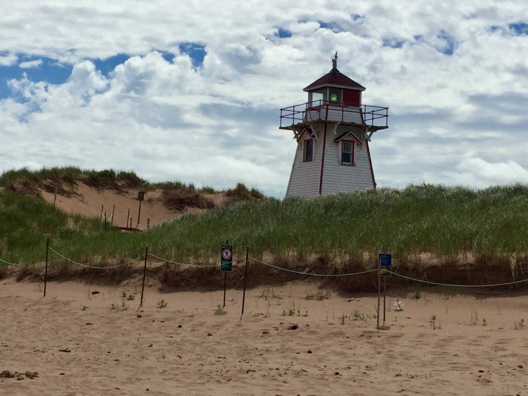 From the national park we headed east on PEI-2 to Souris, about an hour’s ride, the goal being to visit the “singing sands” at Basin Head Beach on the eastern shore. Apparently this beach was once voted (by somebody) as the best in all of Canada, and it certainly is a fine beach, distinguished from all the others on PEI by its white (not red) sand. It is a unique set-up, though — you approach the beach via a warren of boardwalks which take you through an area of gift shops and concession stands, past fully-enclosed picnic shelters (really, a picnic table inside a roofed cabin!), and over the outlet of a river, where a diligent collegiate-aged lifeguard was watching young and old jump the ten feet off the boardwalk and into the river which empties here into the sea. We were impressed by this, as today was by no means a “beach day” by our standards — about 65F with a stiff gale blowing and more clouds than sun by a long shot.