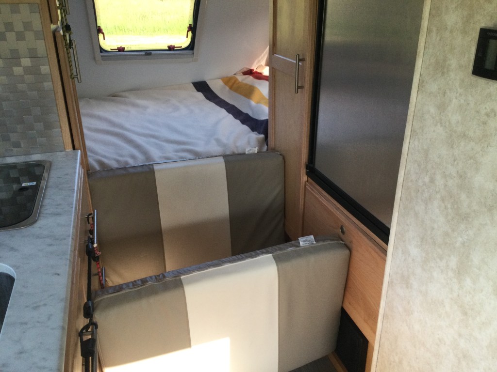 And finally, the dinette itself will slide about the cabin and bash the woodwork if it is not lowered into the bench position for travel: