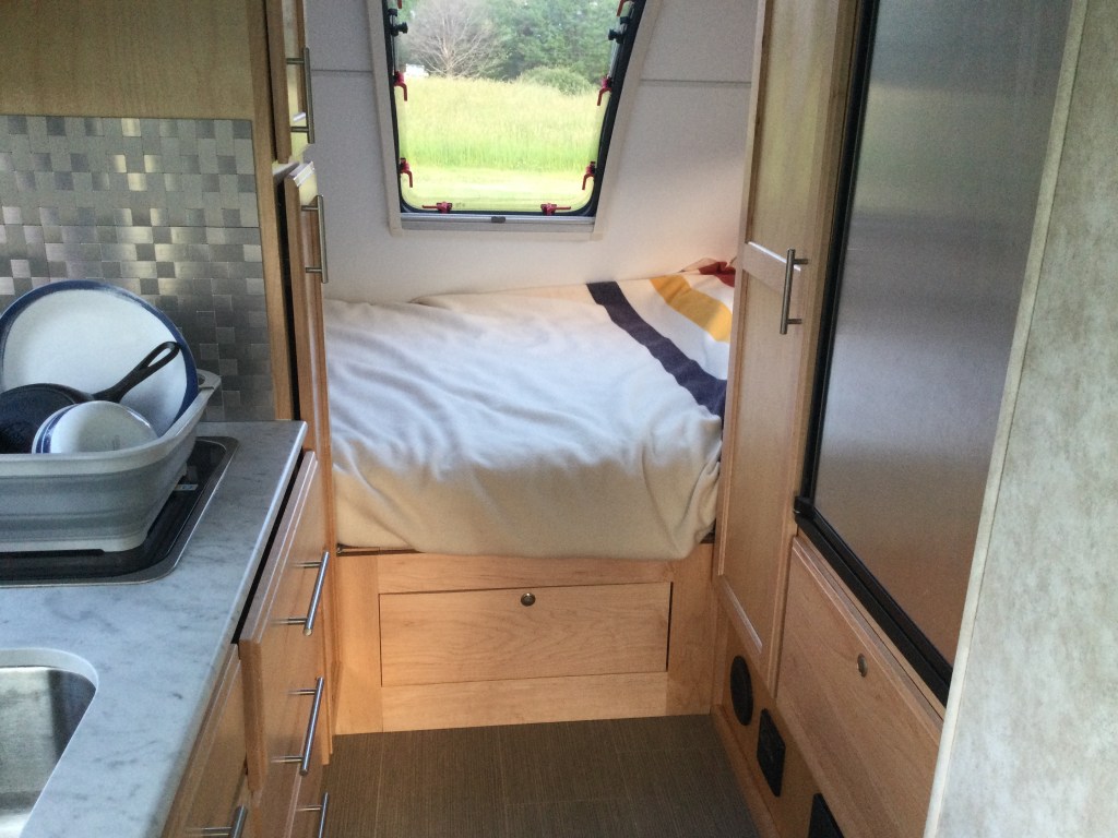 All of this is to say nothing of the work that needs to be done OUTSIDE the trailer before departure: shutting off the propane, raising the stabilizer jacks and step, disconnecting the electric cord and the water and sewer hoses, stowing the wheel blocks and attaching the truck to the trailer. So, there’s a strong half hour of work to do before departure, assuming all goes smoothly and efficiently. I would say it’s no quicker than setting up or taking down a tent, but the difference is that the trailer comes with a kitchen, bathroom, refrigerator and queen bed — and it serves as basic shelter immediately, with no setup needed (say, in the event of pouring rain). And there’s no having to stow a wet tent, only to have to set it up wet again later, either!