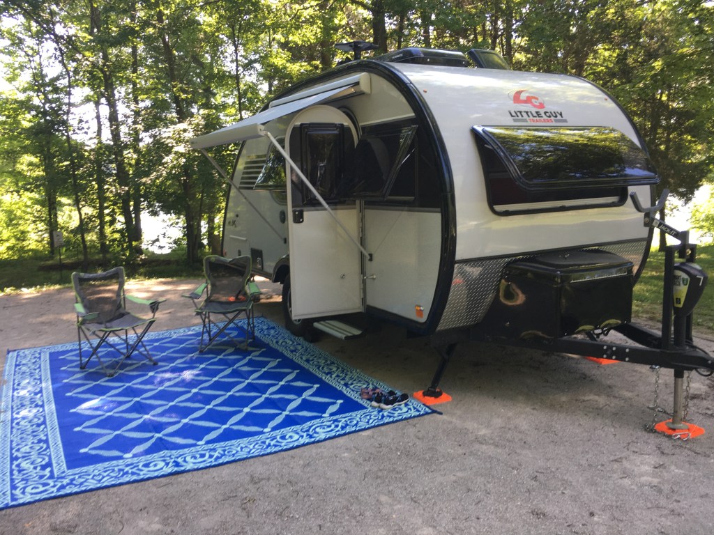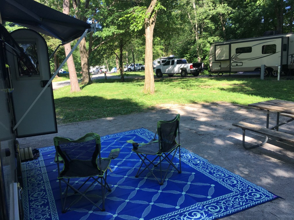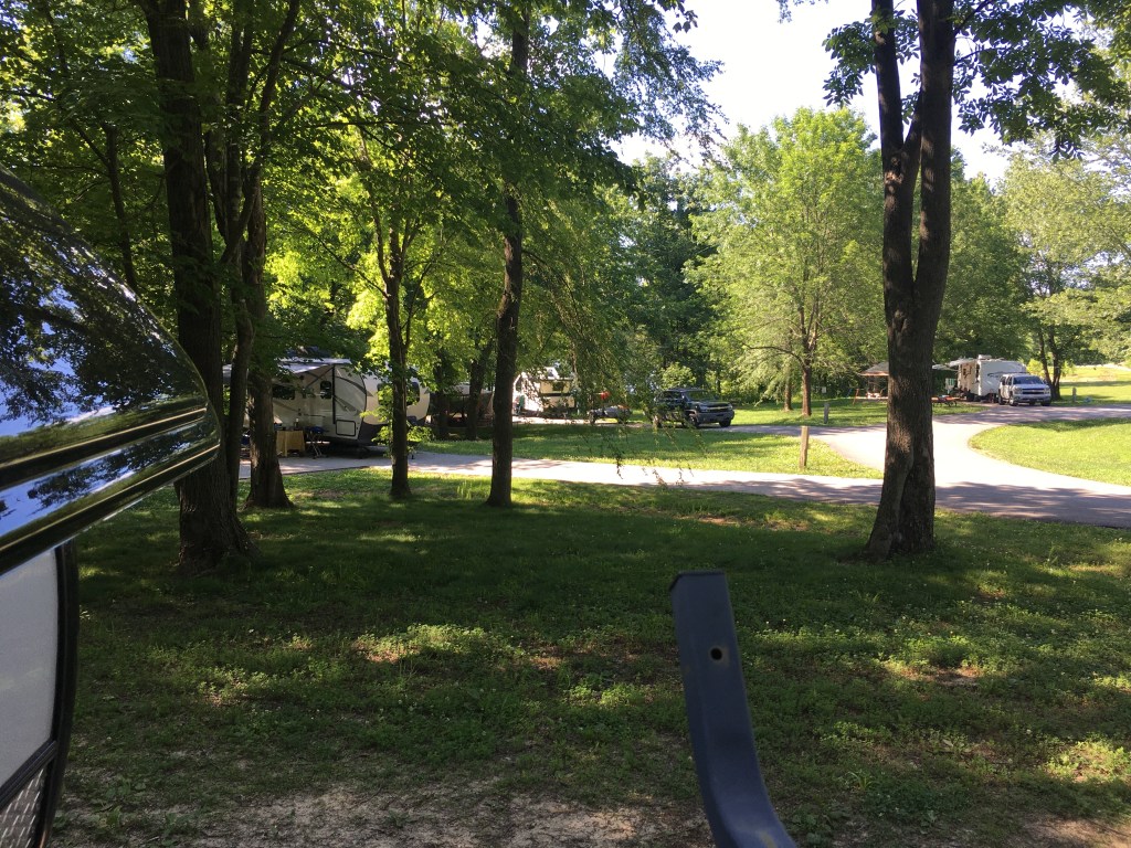 I was also surprised to find, back in April when planning this trip, that many of the local RV and state parks would be sold out already. Thus, we were not able to reserve our preferred dates and ended up staying there midweek. “There” was Nolin Lake State Park, created when the Green River (also the engine which created Mammoth Cave) was dammed in 1963 to create Nolin Lake; the park itself opened in 1996 and is one of the most beautiful state parks I have seen — not in the sense of stunning scenery, but rather in the intelligent design and careful construction. Every campsite is crushed rock, large, flat and widely separated from its fellows, giving as much privacy as one could hope for in such a setting. Here’s our campsite: