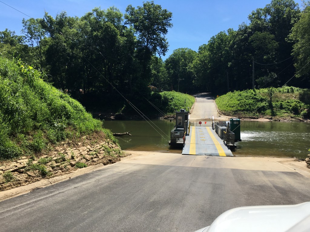 One of the curious and charming experiences in visiting Mammoth Cave NP is the crossing of the Green River on the way to the park. The river, where it crosses the road, can’t be more than fifty yards wide; yet, rather than build a bridge, there is a ferry!