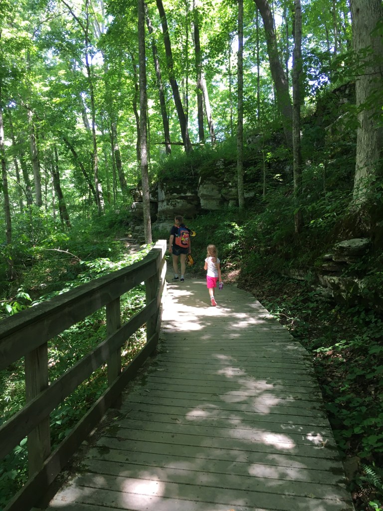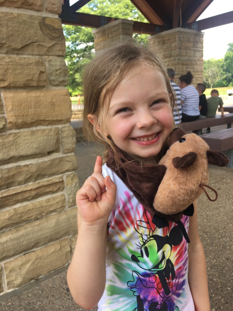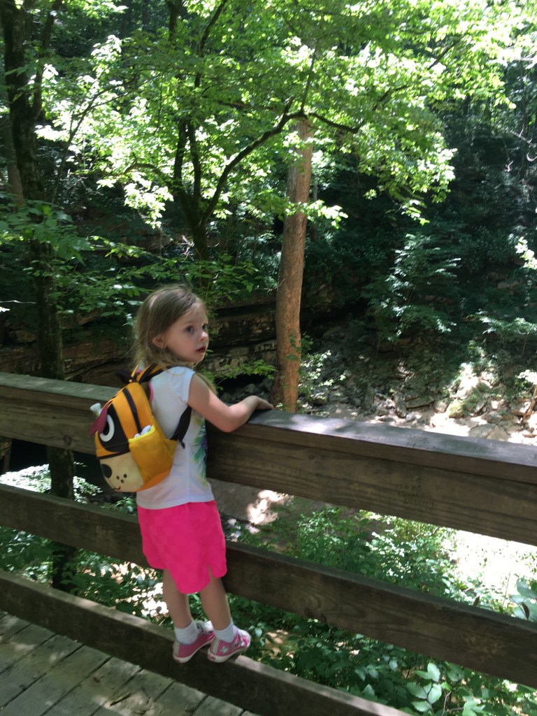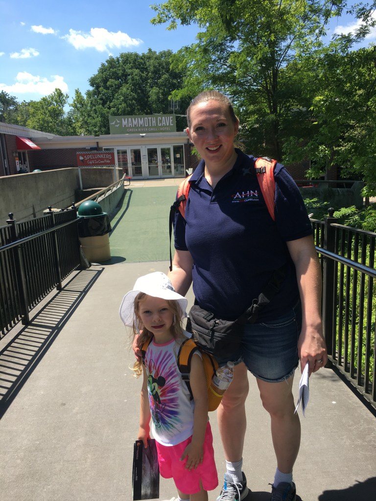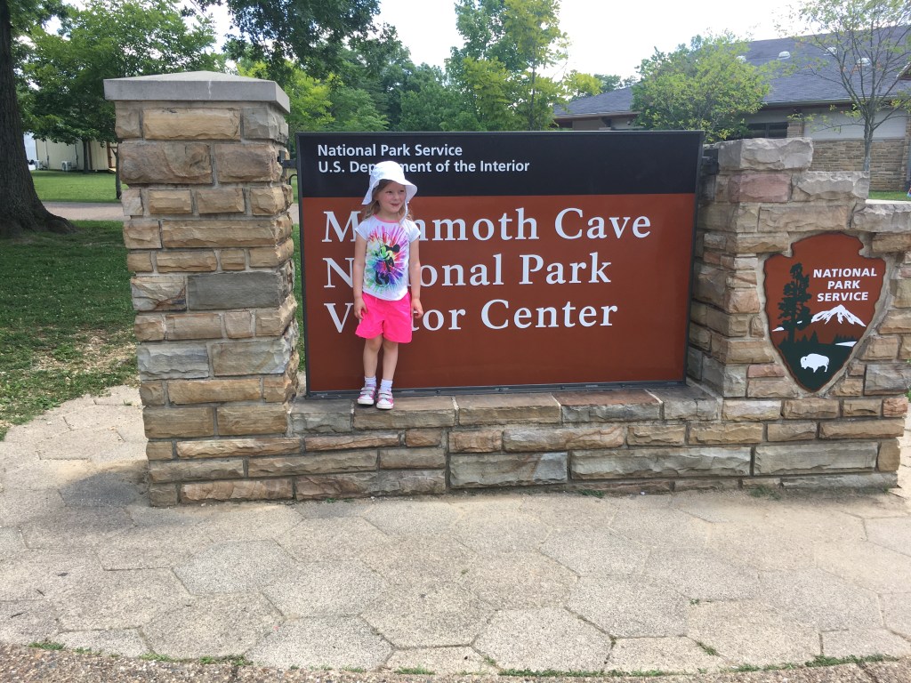 One critical piece of information that we wished we had possessed upon arrival is that the tours of Mammoth Cave must be reserved in advance; thus, the only tour that we could get onto was a self-guided tour of the very upper level of the cave. If you want to see the most celebrated features of the cave, however, you must reserve a guided tour. We were there on a Thursday and all the tours were sold out through the weekend except for the self-guided one — but even that required a two-hour wait. So, we bought ice cream and visited the gift shop. Granddaughter Layla was enamored of the plush bats on sale there:
