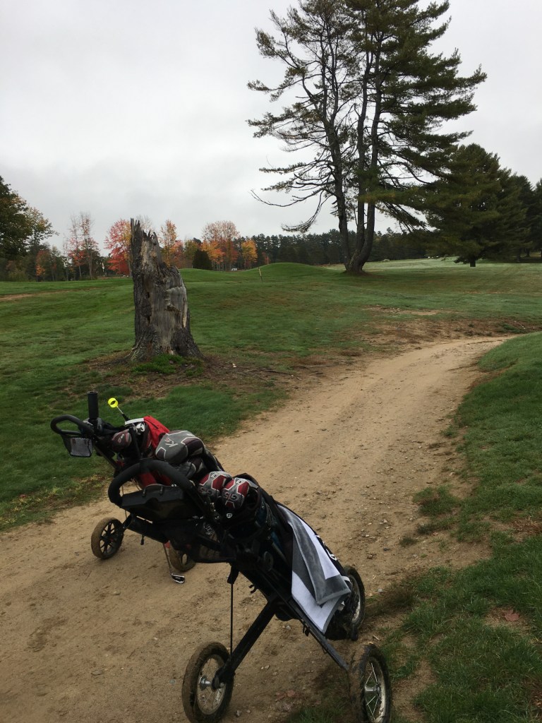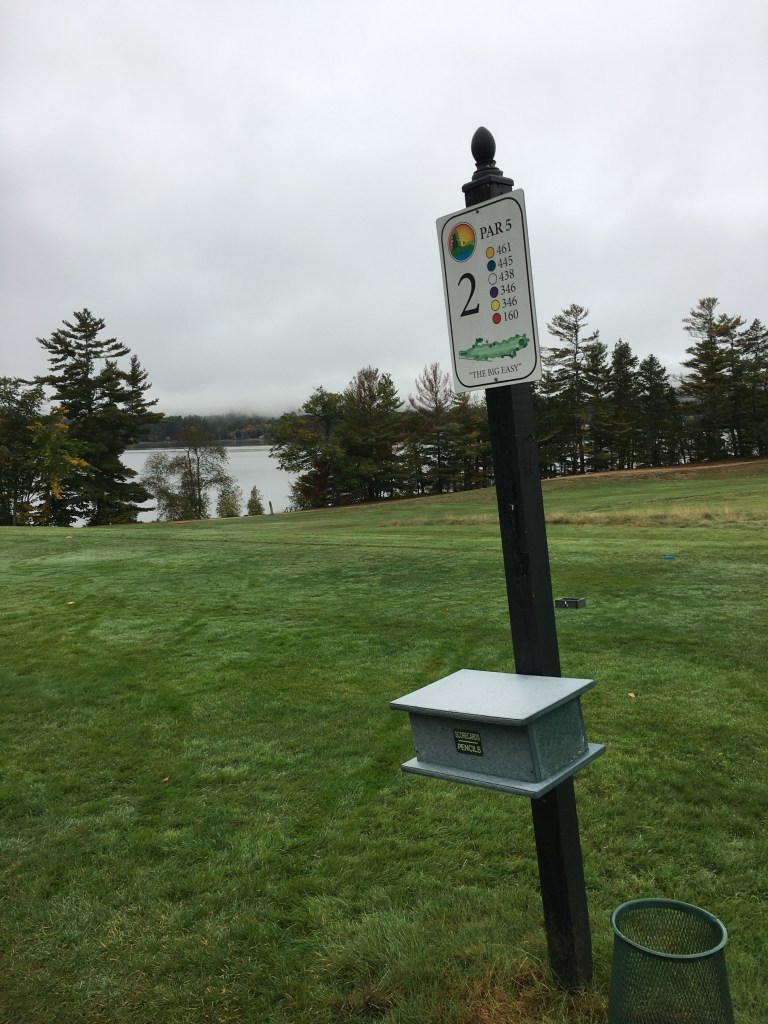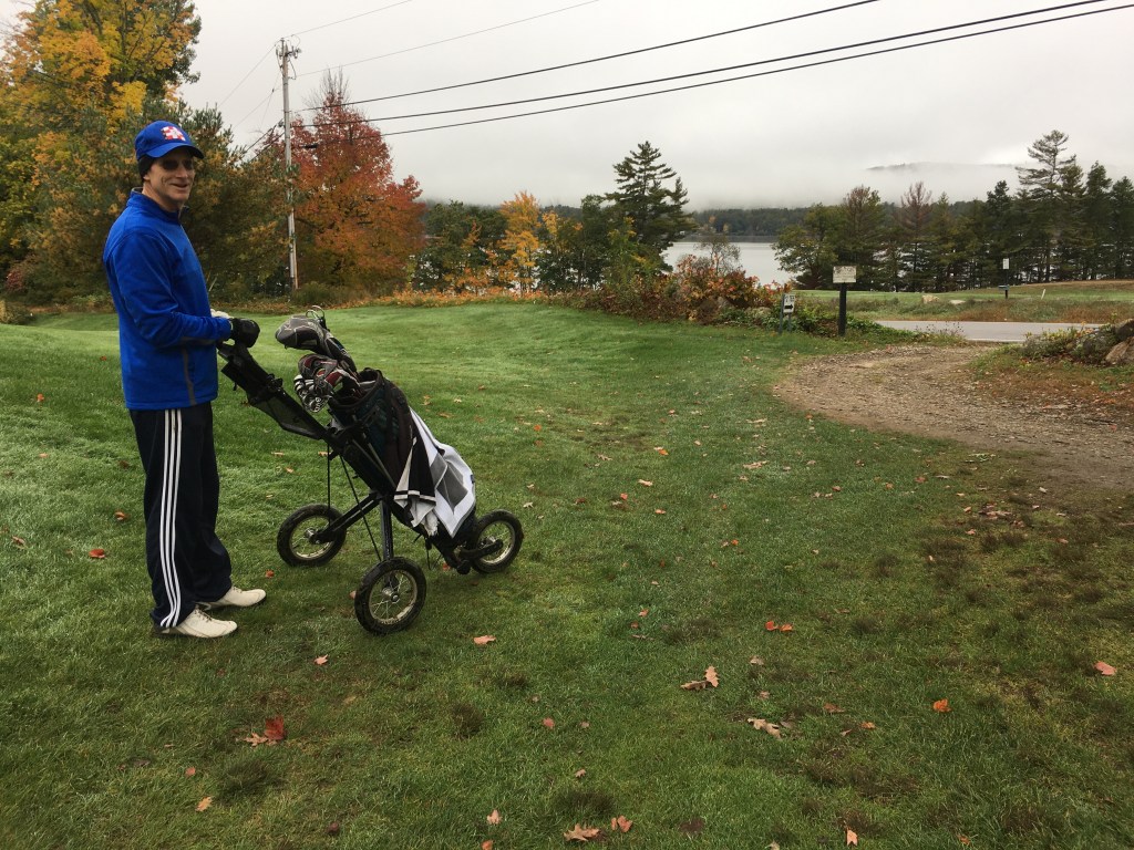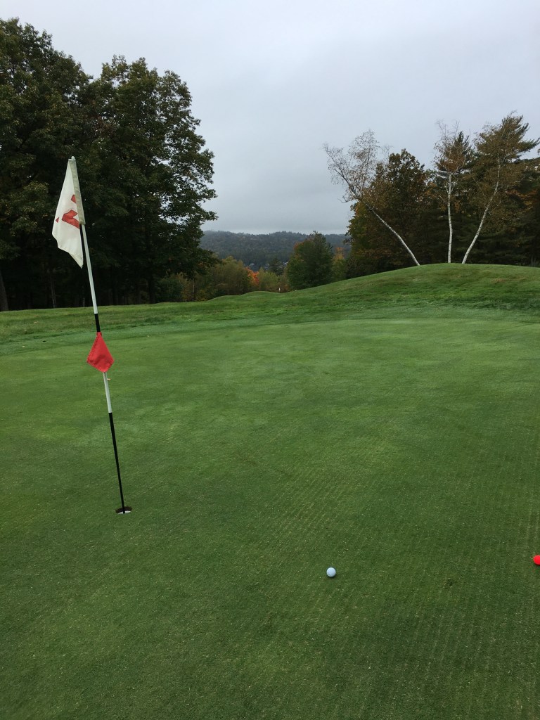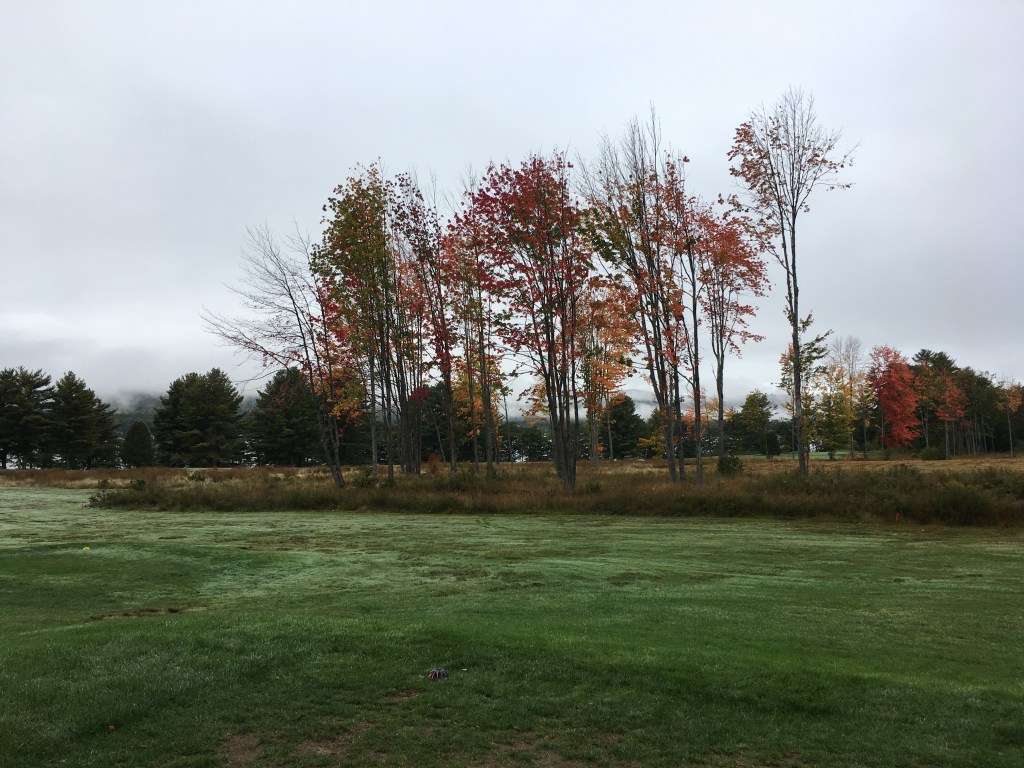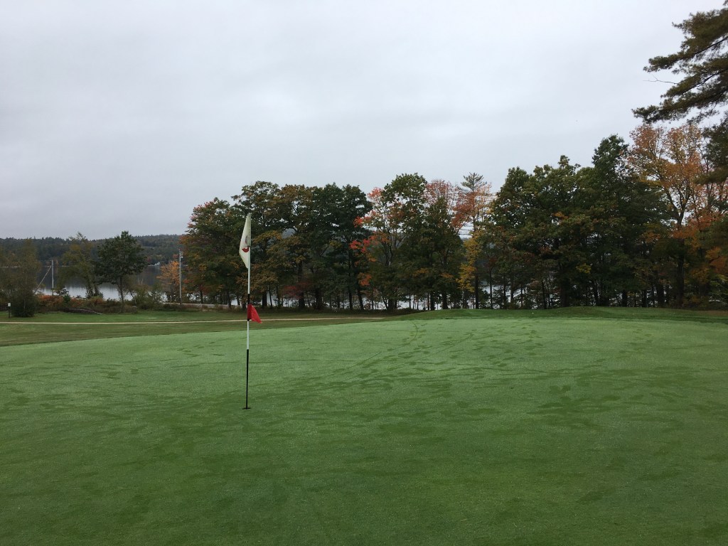 The photo above was taken just right of the first green at Province Lake GC, so named for its proximity to Province Lake, which can be seen from several of the holes, one of which runs right alongside the lake. We arrived for a 2PM tee time on Saturday and were greeted with fog and drizzle, which dampened our gear but not our spirits. The fall foliage was nearing peak here and even through the gloom, the course was lovely.