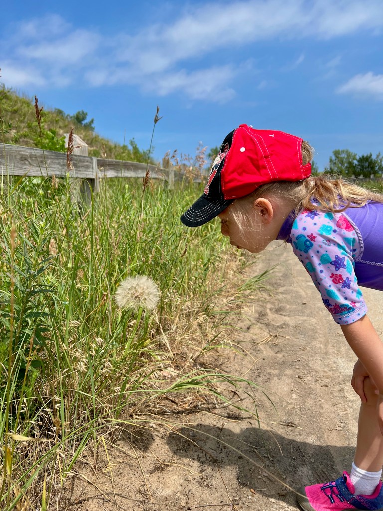 Layla found an interesting huge “dandelion” on the way to the staircase, but despite her best efforts, she could not blow the seeds off it. We decided it was probably not a dandelion after all.