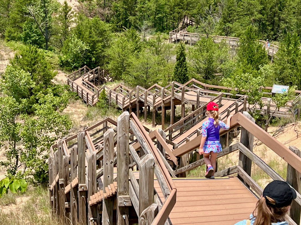 Several striking views of Lake Michigan are afforded by the climbs to the top of the dunes:
