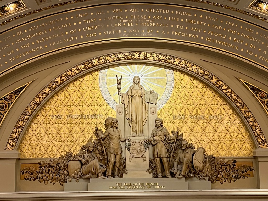 Here is a close-up of the bas-relief on the wall below the skylight. The barely-visible inscription on it reads “Vox Populorum Est Vox Dei” (the voice of the people is the voice of God). And let me here encourage all young readers to ensure that they study Latin in high school — you’ll never regret it!