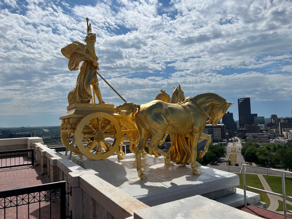 Overlooking the entrance to the Statehouse, just below the Capitol dome, is the Quadriga — four horses, being led by two women while pulling a chariot and driver. The horses represent the four elements (earth, air, fire and water); the women are Agriculture and Industry; the driver is Prosperity. Thus, agriculture and industry manage the four elements to keep the state moving forward into prosperity. I was shocked to learn from our excellent tour guide that years ago the Quadriga was accessible to the public, despite its three-story height above the granite steps — and people routinely put their kids up on it for photos! Apparently as a result, this remarkable artwork was defaced with graffiti; a recent refurbishment with 24-carat gold leaf has restored it to glory: