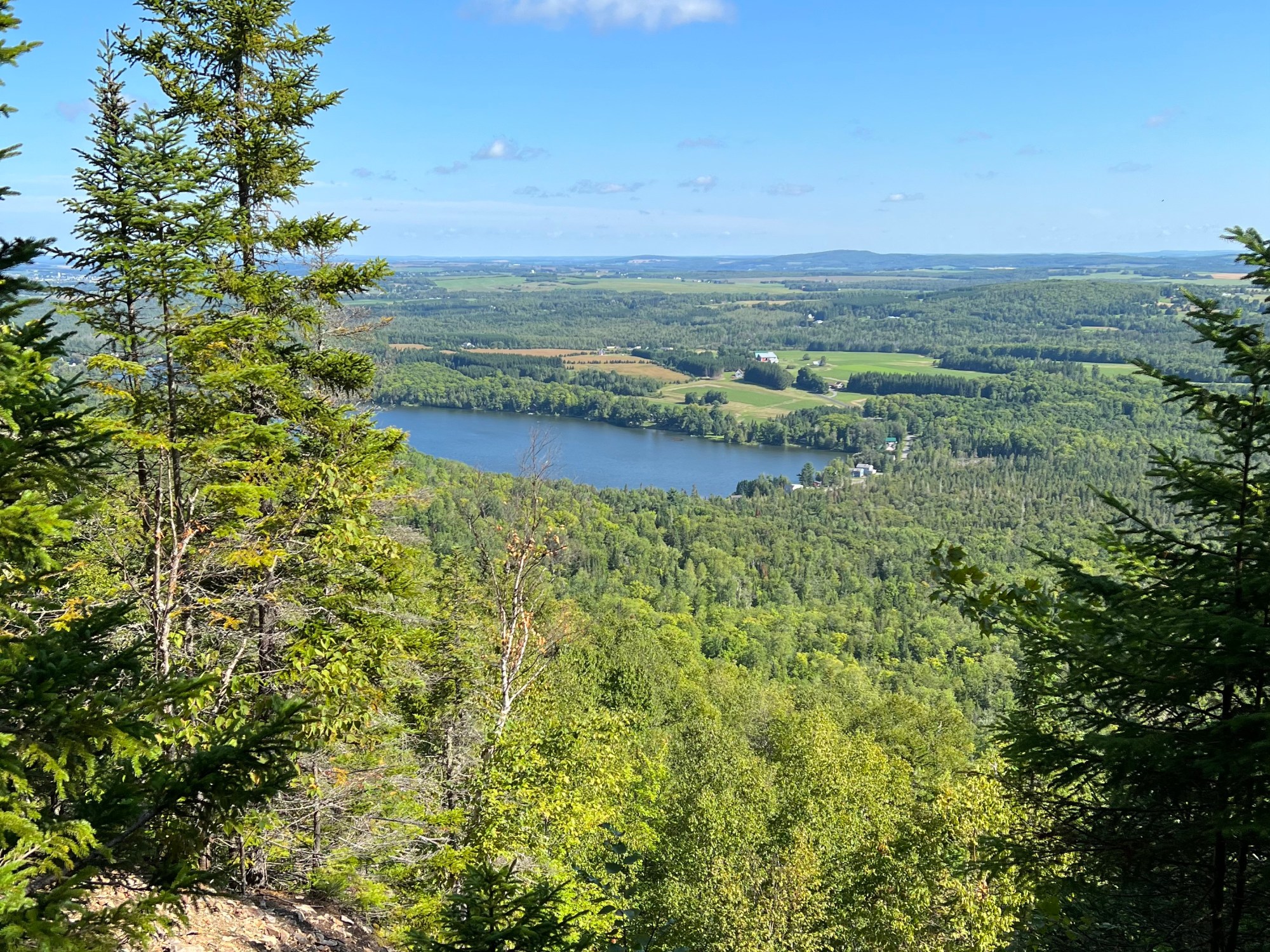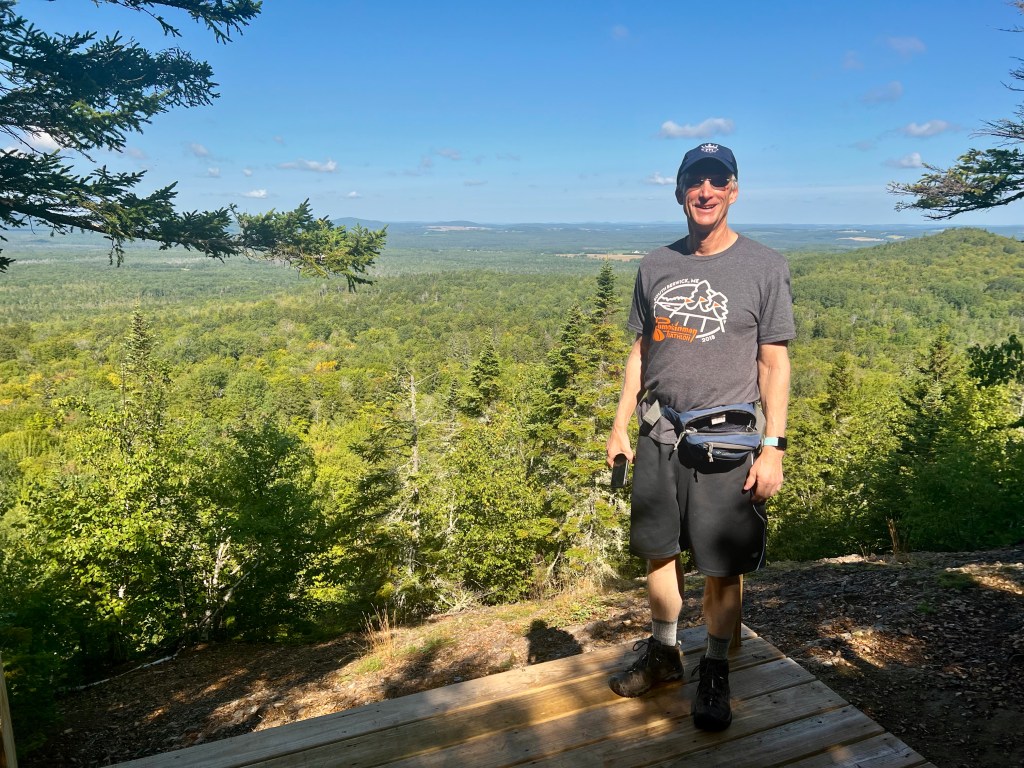 Anyway, we arrived here on Monday afternoon, played Aroostook Valley on Tuesday and Wednesday, and on Thursday we climbed the two peaks of Quoggy Joe. These peaks range in height from about 1200 to 1400 feet, nothing much when compared to Katahdin or the higher peaks in western Maine — but these trails are STEEP. I’m in okay shape but there were sections which nevertheless required me taking a breather every thirty yards or so. The upside, of course, is that you quickly arrive at scenic views. The next three photos were taken from the summit of South Peak (from a platform built there as an Eagle Scout project!), the trail for which is accessed behind campsite #18 at Aroostook State Park. Note that the trails across the two peaks of Quoggy Joe form a circle, most convenient for anyone camping at the state park; depart at campsite #18, climb the mountains and then return to the boat launch. However, it is STRONGLY RECOMMENDED that you start at campsite #18 and ascend South Peak first, so that you are climbing UP the steepest sections of the route. In other words, traverse the circle in a clockwise direction, first heading west to South Peak, then north from there across the saddle to North Peak, and then finally south and west back to the campground. Trying to climb down the trail from South Peak to the campground would be extremely difficult, if not actually dangerous, in my opinion — and attempting it in the rain when the trail is wet would be suicidal.