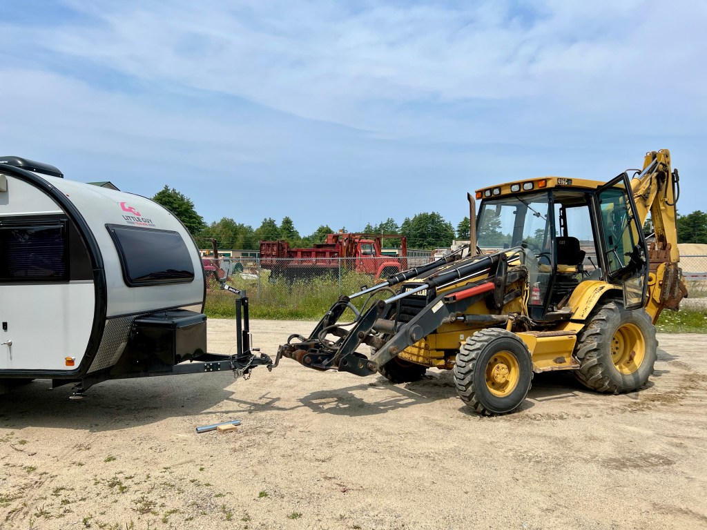 So, another tractor was employed, this one with a trailer hitch on it, to lift the Little Guy once again so that a third jack could be installed. Again, to their credit, the dealer deployed a technician immediately to put on a replacement; except that there were no more side-crank style jacks in stock, so I had to settle for a helicopter-style crank — which means that I can no longer mount the bike rack. At least the trailer didn’t crash to the ground this time!