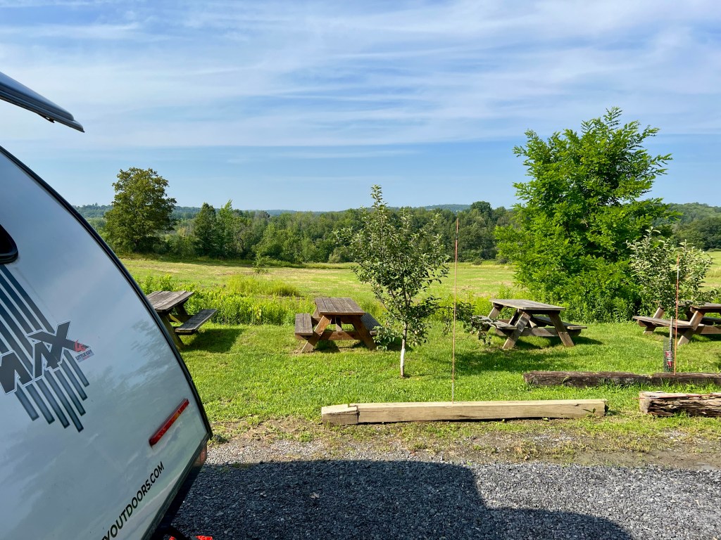The grounds here are immaculately kept and include a gazebo (not pictured) along with several picnic tables, all overlooking a lovely orchard.