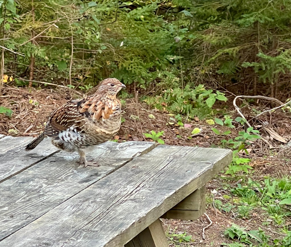 Tonight’s campsite is in the Caribou-Munroe Island Provincial Park, analogous to a Maine state park, and in fact is very reminiscent of Maine’s Cobscook Bay state park. When we arrived at our campsite, a ruffed grouse was on hand to make us welcome. Cheeky as he is, the picnic table was no obstacle to him in his search for a handout.