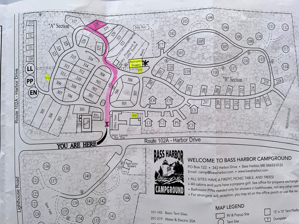 For the last three days we have been camped at Bass Harbor Campground, an RV park on the west side of Mt. Desert Island. This is a nice spot, largely because the sites are arranged as circles in the woods; therefore, there are trees on every site and there is none of that “RVs lined up in a parking lot” feel to it. Rather, it feels a lot more like a state park campground than do many of the RV parks at which I have stayed. You can see what I mean from the map below: