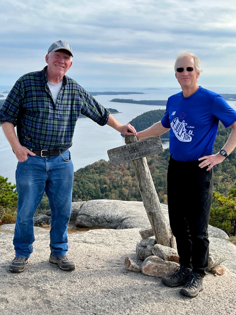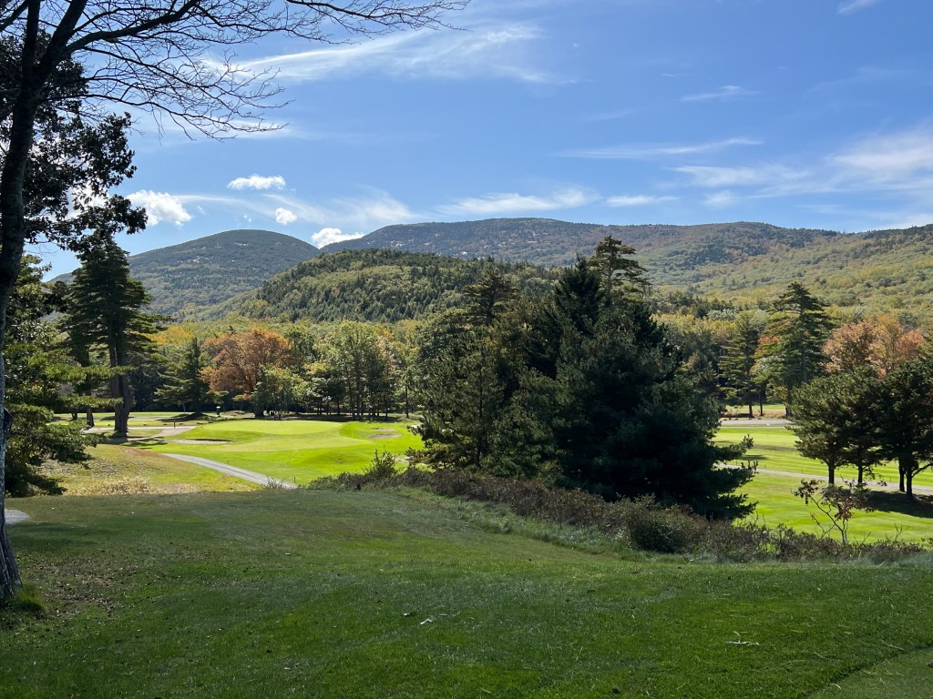 Yesterday, we spent the day golfing at the venerable and excellent Kebo Valley course in Bar Harbor, one of Maine’s best. I did a post on this in 2020 if you are interested in checking back for it, but today there was new wrinkle; hole #4 has two tee boxes, and until today we have always found the lower, right-hand one to be in use. But on this visit they were using the upper box on the left side of the par-3 hole, making for a new and completely different challenge. Here’s the view from this tee box; the green (the target!) is left of center in this photo.