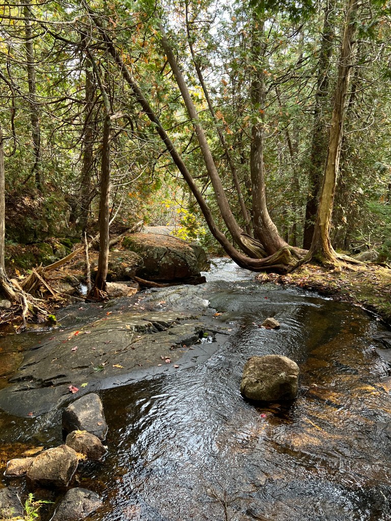 Having somehow survived the treacherous and demanding ascent, and spending ourselves completely in the attempt, we decided not to complete the entire loop (which would have required managing the very steep trail back down to the St. Sauveur trailhead). Therefore, we took the much easier trail down to the Acadia Mountain trailhead and walked the road half a mile or so back to our truck. I would highly recommend that all but the fittest use the Acadia Mountain trail up and back down — only the very athletic should consider the loop trail from Acadia over to St. Sauveur and down. The trail down from Acadia Mountain follows a lovely stream, seen below:
