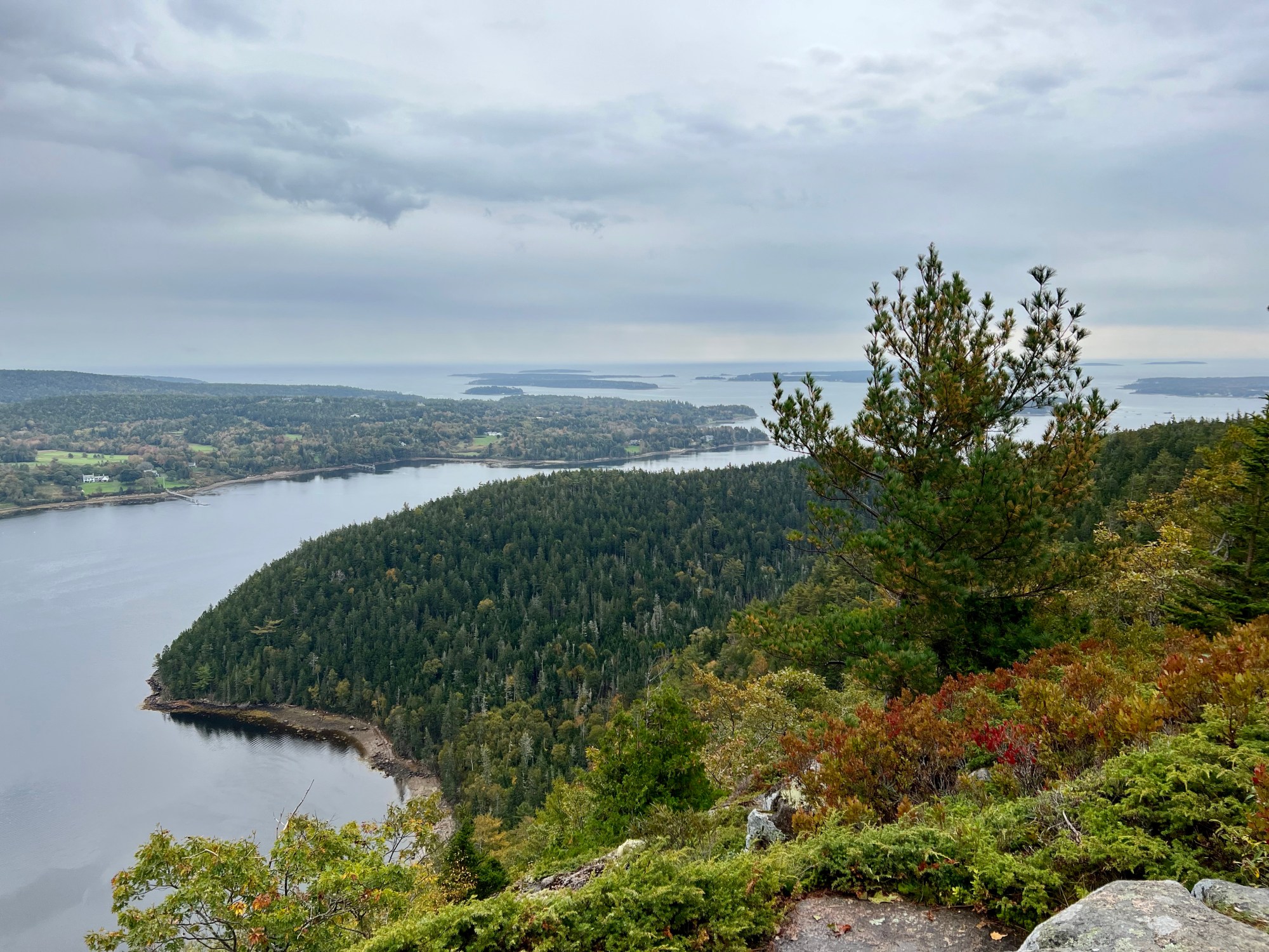 After that, we decided to attempt a loop over St. Sauveur and Acadia Mountains. We first stopped at the Acadia Mountain trailhead but found the parking lot full and cars parked on both sides of the road. Consequently, we decided to do the loop from the other direction and started at the Mt. St. Sauveur trailhead. This trail was quite steep, gaining elevation quickly to afford a nice view of Somes Sound: