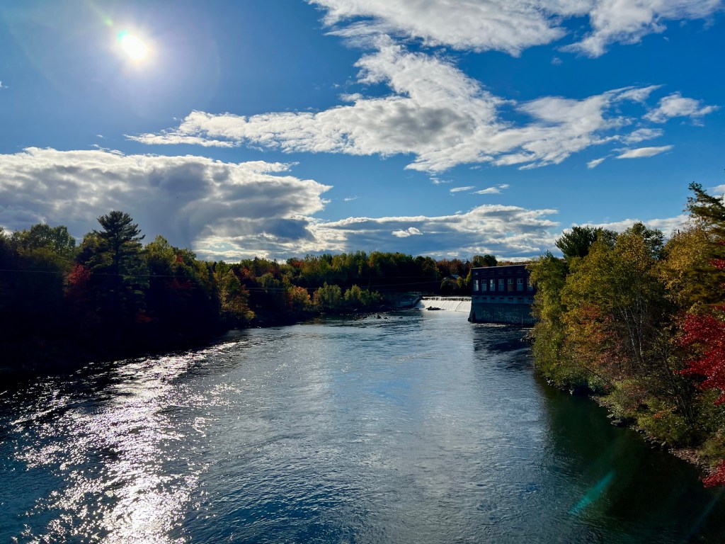 Michelle said that if I walked about a half-mile to the left on the ITS, I would come to a bridge over the river from which is a view of Mt. Katahdin. I did so but could not see the mountain, perhaps due to low clouds. However, I did capture this photo of the Medway dam, by means of which Brookfield Energy generates electric power: